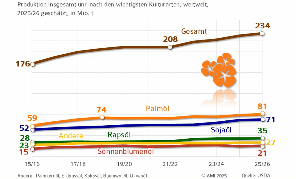 Palmöl bleibt das weltweit wichtigste Pflanzenöl. Für 2025/26 wird eine Produktion von ca. 80,8 Mio. t erwartet – ein Zuwachs um 1,9 Mio. t gegenüber dem Vorjahr. Größte Erzeugerländer sind Indonesien (47,5 Mio. t) und Malaysia (19,5 Mio. t), gefolgt von Thailand (3,4 Mio. t). Die Produktion von Sojaöl dürfte um 1 % auf 70,6 Mio. t steigen. China bleibt mit 20,5 Mio. t der weltweit größte Hersteller, gefolgt von den USA mit 13,7 Mio. t. Die Erzeugung von Sonnenblumenöl wird 2025/26 voraussichtlich 21 Mio. t erreichen, ein Plus von rund 4,5 %. Die Rapsölproduktion steigt auf 35 Mio. t.