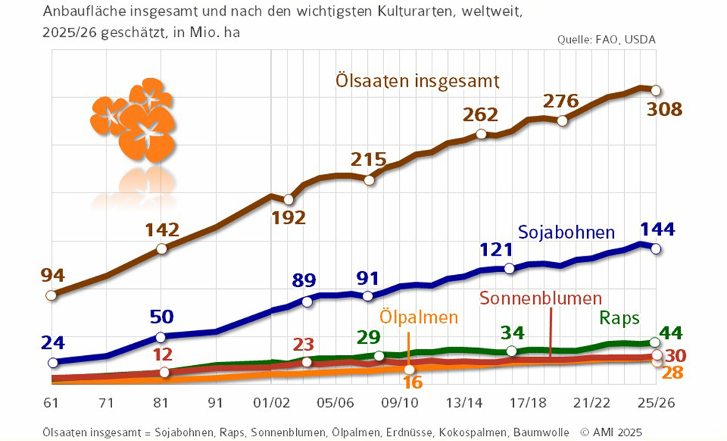 Die weltweite Ölsaatenanbau wird im Wirtschaftsjahr 2025/26 voraussichtlich 308 Mio. ha erreichen, etwas weniger als im Vorjahr (–0,4 %). Der Rückgang ist vor allem auf die geringere Dynamik im Sojaanbau zurückzuführen. Schwächere Margen, höhere Produktionsrisiken und strengere Nachhaltigkeitsvorgaben bremsen insbesondere in Südamerika die Ausdehnung des Sojaanbaus. Die Fläche für Sojabohnen sinkt 2025/26 auf 144 Mio. ha.