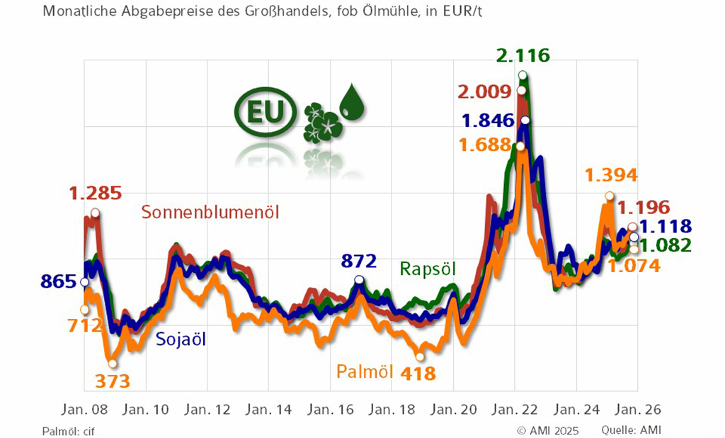 Die seit 2021 angespannte Lage am Pflanzenölmarkt verschärfte sich 2022 mit dem Krieg in der Ukraine. Die Exportunsicherheit im Schwarzmeerraum löste einen kräftigen Preissprung aus, der sich im weiteren Verlauf zügig wieder normalisierte. 2025 zogen die Großhandelspreise in der EU erneut an und lagen wieder durchweg über 1.000 EUR/t.